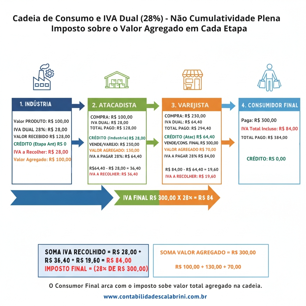 Para ilustrar o mecanismo da não cumulatividade plena e a tributação sobre o valor agregado, consideraremos uma cadeia produtiva simplificada, utilizando uma alíquota hipotética de 28% para o IVA Dual (IBS + CBS combinados) em todas as etapas, e base de cálculo líquida (já excluídos os tributos, conforme o cálculo “por fora”).